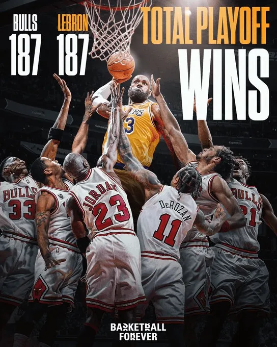 美媒Basketball Forever晒出海报:詹姆斯季后赛生涯拿到187场胜利,而芝加哥公牛队史季后赛胜场数也是187场(公牛187胜联盟第九)。